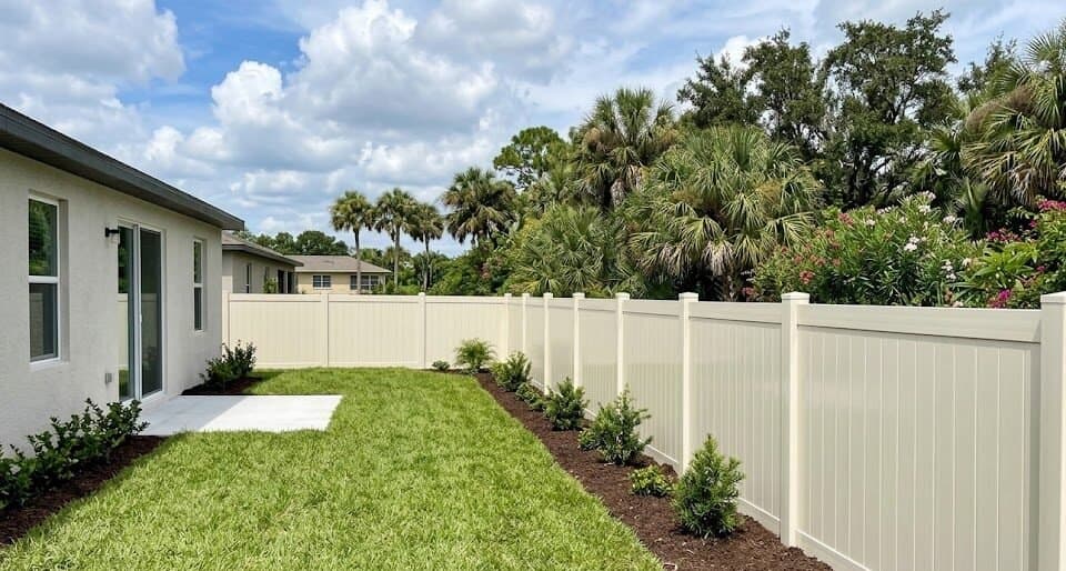 - Vinyl privacy: the dominant pick for back yards, particularly for vacation-rental properties where guest privacy from neighboring lots is a real selling point. UV-stabilized white, almond, and tan are the standard colors.
