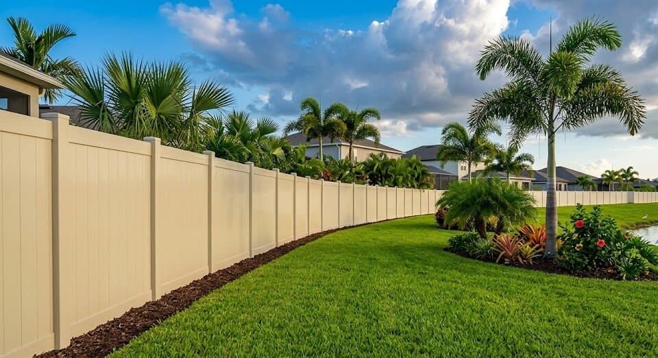 Vinyl privacy at 6 feet in the HOA-approved color provides the tongue-and-groove construction that maintains the gap-free screening the closely spaced Kissimmee homes require without the board shrinkage the wood alternative develops during Polk County's dry-season periods when the reduced humidity contracts the grain and opens the 1/8-inch sightline gaps between boards the wet season's return temporarily closes. The solid vinyl panel blocks every viewing angle at every time of day because the continuous PVC surface contains no gaps the light passes through regardless of the sun's position relative to the fence's orientation.