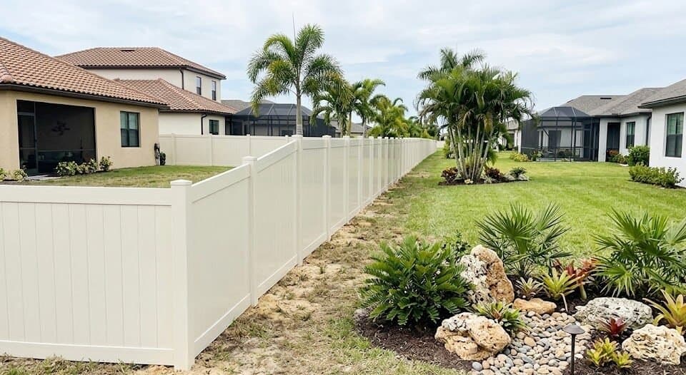 Vinyl privacy at 6 feet with Lakeland-soil bell footings costs $28 to $42. 8-foot noise-reducing tongue-and-groove for I-4/Polk Parkway costs $38 to $52. Aluminum ornamental at 42 to 48 inches costs $28 to $42. A 150-foot Lakeland backyard runs $4,200 to $6,300.
