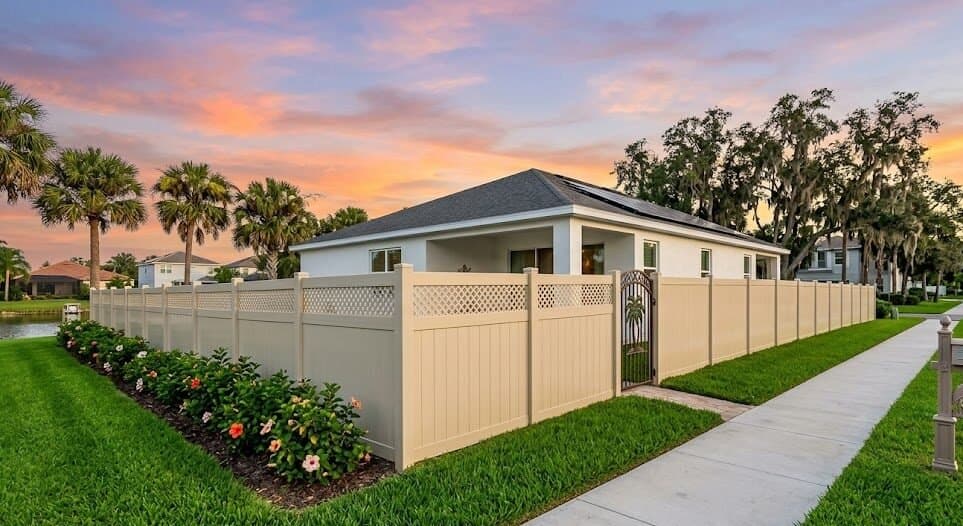 - Wood (board-on-board cedar or pressure-treated pine): works for HOA communities that require natural-material fencing. Needs sealing on a Florida moisture cycle.
