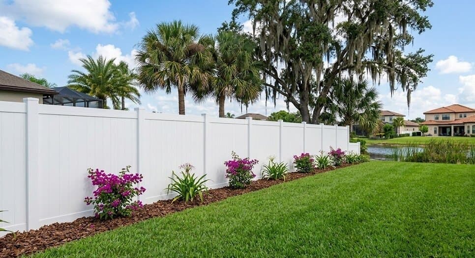 Vinyl is the most common pick for inland mainland yards that want full privacy between the home and the neighbor. UV-resistant white, almond, and tan are the standard colors; wood-grain textured vinyl is a softer profile for HOAs.