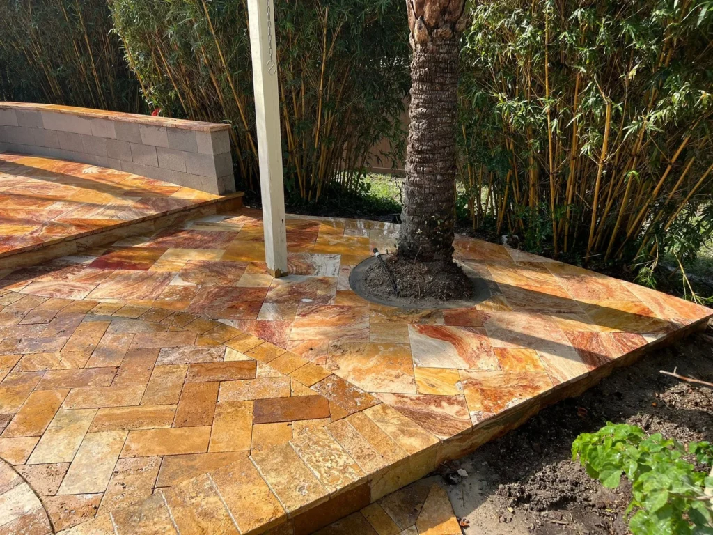 A small business had a patio area with cracked concrete and a patch of grass that turned to mud. Customers tracked dirt inside, and the space looked worn.